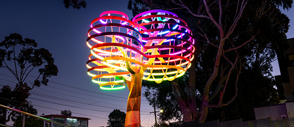 We worked with metal artist Matt Hill to create an outdoor art piece, using a bespoke outdoor lighting design to transform the installation from looking incredible during the day to looking spectacular by night. Find out more.