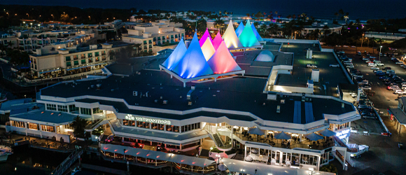 Aqualux was involved from the concept development stage through to the design and installation process, along with Alpha LED and Wolfie IT. The project brief was to illuminate the sails of the landmark Marina Mirage shopping center and utilise the structure as a canvas for RGB illumination according to various events and other lighting requirements.