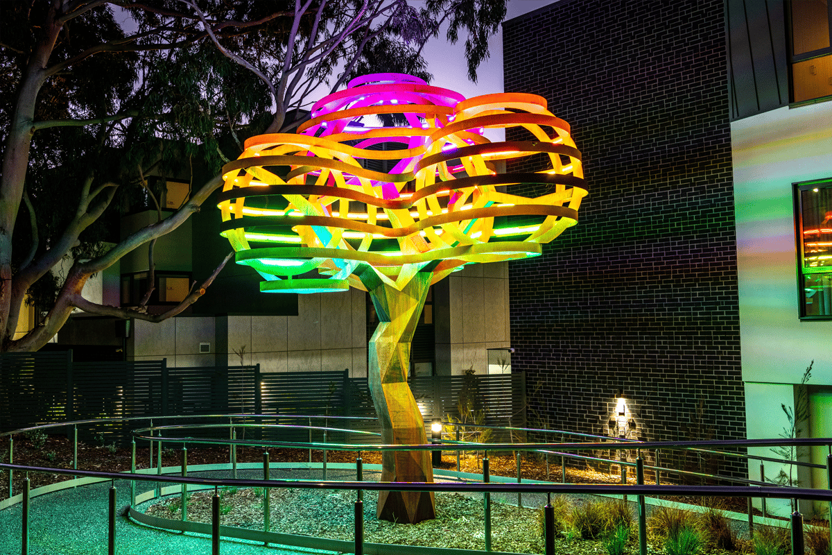 THE APPROACHWe worked flexibly with Matt through the design phase, providing samples and workshopping different outdoor lighting design options to achieve the desired outcome –an illuminated 3D full-scale metal tree sculpture. To showcase the sculpture’s structural beauty, we proposed a twelve-level, independently controlled lighting system programmed to illuminate the tree in a changing rainbow of colours. We also provided a simpler lighting design option to allow for varying levels of complexity and cost. Once the concept was finalised, the client opted for the more complex proposal which featured a dynamic lighting array of colour, representative of changing seasons. |