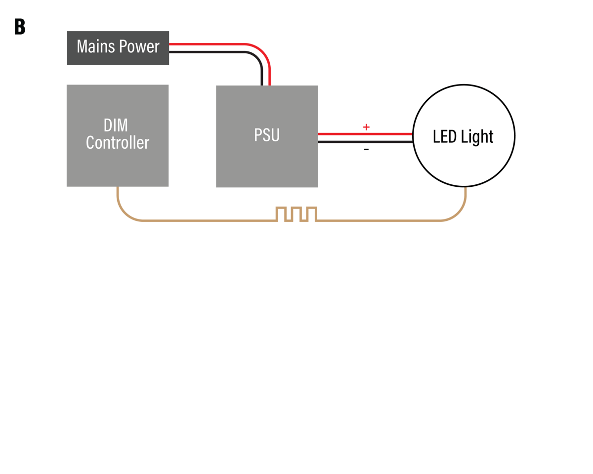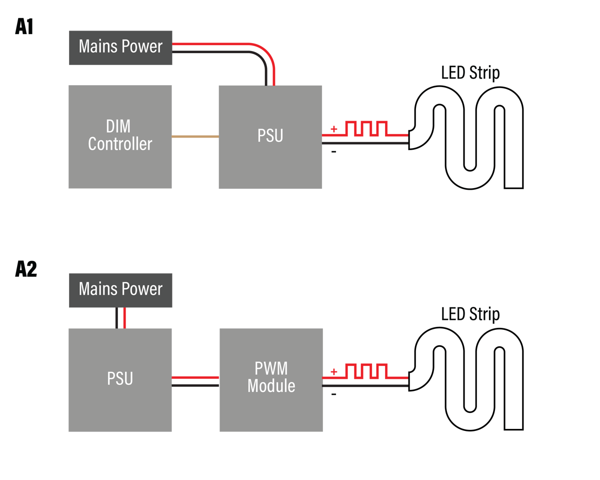 PWM power dimming can be achieved by using compatible power supplies that will require their own dimming control input. It can also be achieved by using a PWM module that sits between the power supply and lighting product and modifies the power to control the PWM dimming.