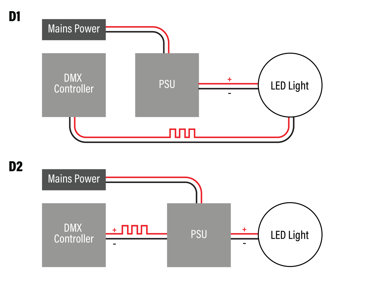 DMX requires a separate set of control cables to carry the data signals from a central controller to the lighting control systems and power supplies. It can be used with both low voltage and mains lighting products as the control system is completely separate from the lighting power supply system.