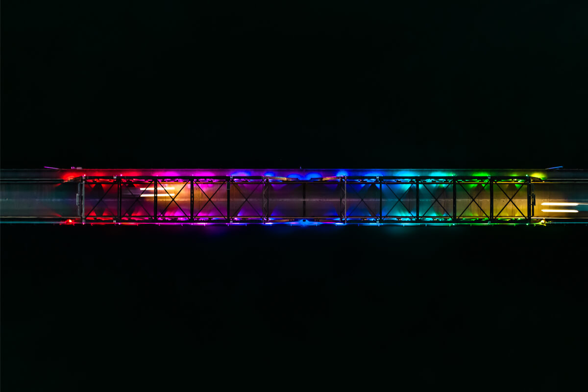 We recommended Lumena Pro AQL-180 for the trusses and pylons, AQL-980 as shore lights and a shimmering light to reflect off the water, and our AQS-510 neon flex product for the sections of strip required on top of the bridge.