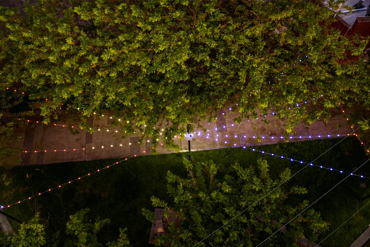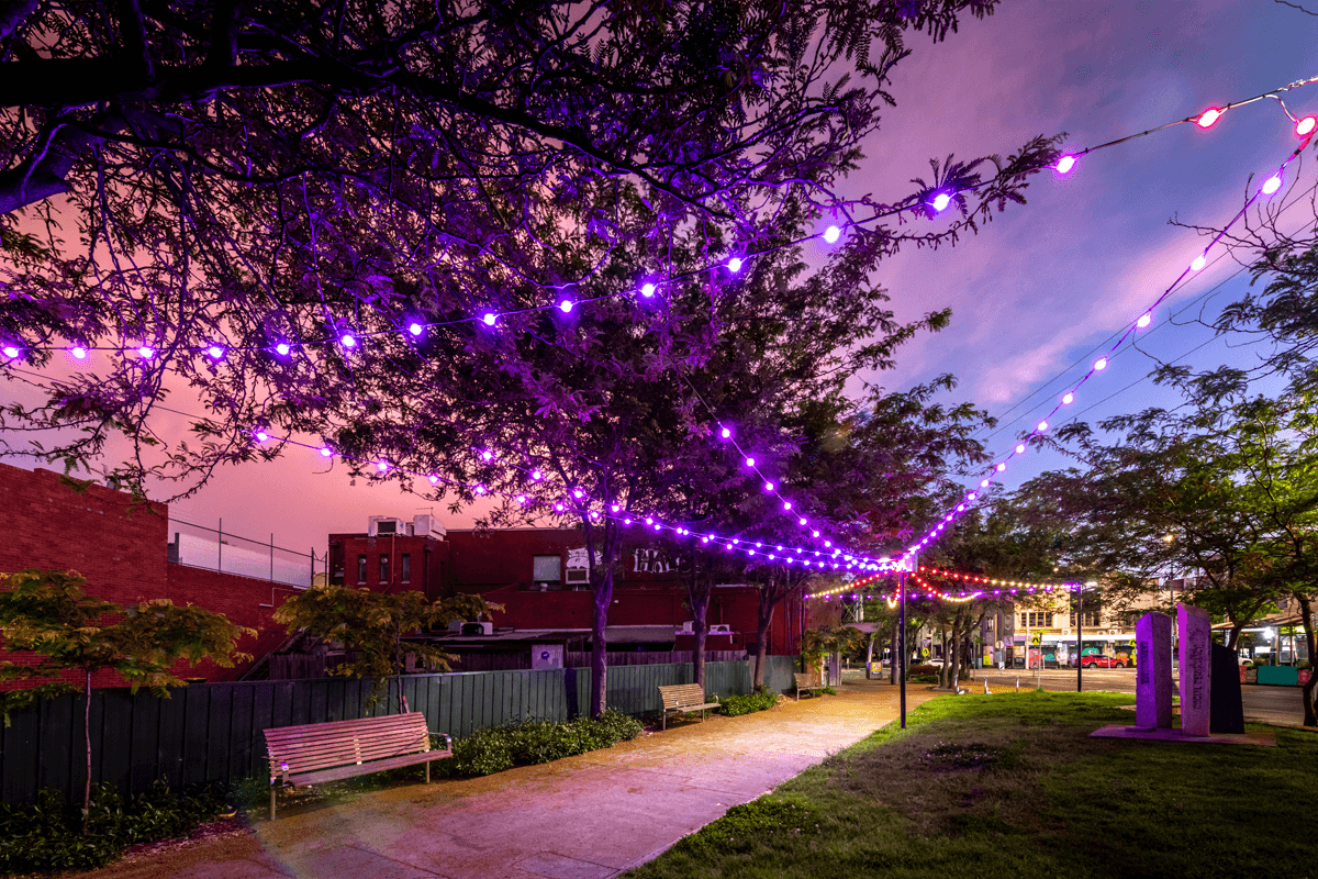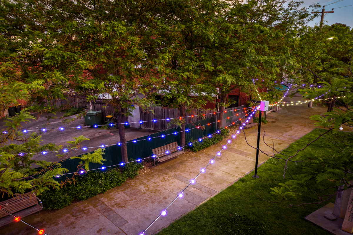 Liardet Street Port Melbourne - Commissioned to turn a small thoroughfare and park area into a festive wonderland working with nothing but light. Using a unique RGB string light and catenary support system we were able to add programmable colour to enliven a public area and entertain passers-by.