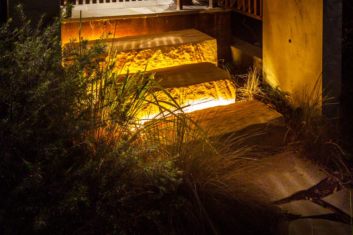 Homeowners - Charlotte (Architect, 6 years) and Mike (landscape designer, 25 years) used their collective knowledge and experience to venture past the usual and expected, bringing the outside inside when designing their home. Mike has years of experience with our products and wanted to use both the AQL-510 in Aged Brass and AQS-500 Neon Flex around the home to illuminate paths, steps and under deck/seating specifically designed by Charlotte.