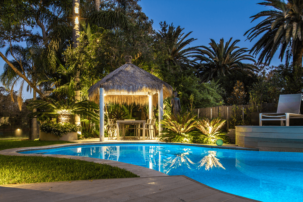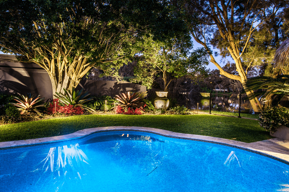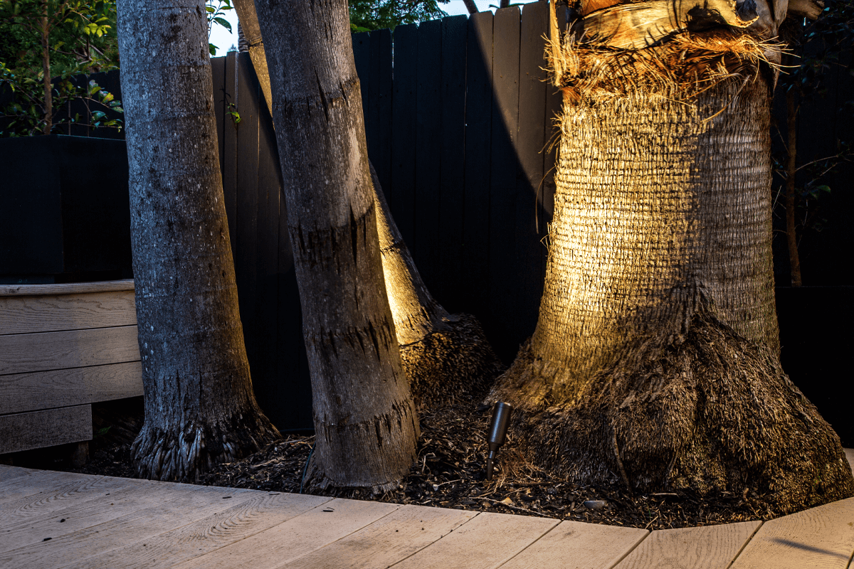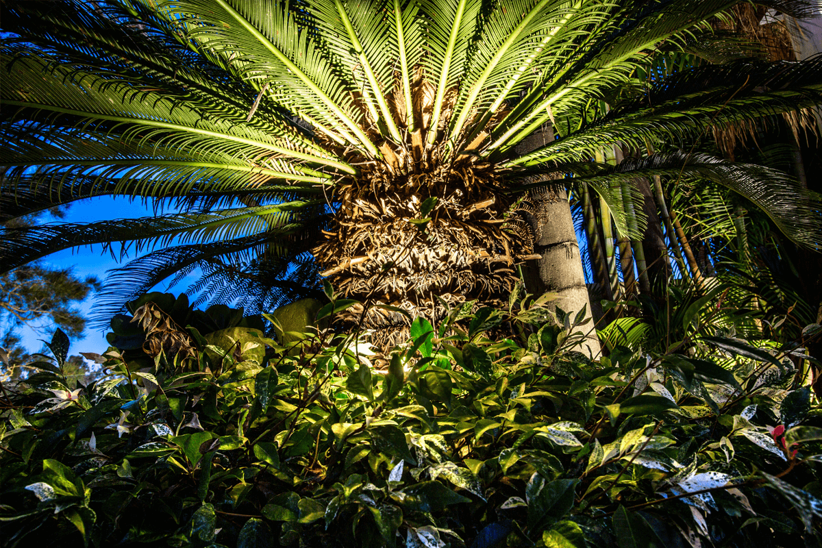 Lakeside Crescent North Manly - The picturesque garden and landscaping, reminiscent of a holiday paradise softly glow a warm white through the foliage creating a mixture of shadows and highlights. The AQL-122 define the edge between grass and garden, while the AQL-115 illuminate the palms and tropical plants.