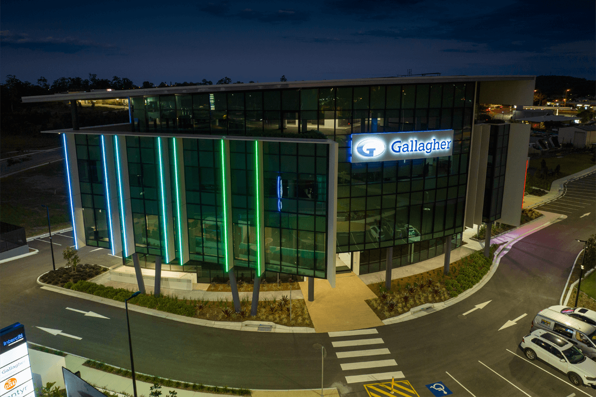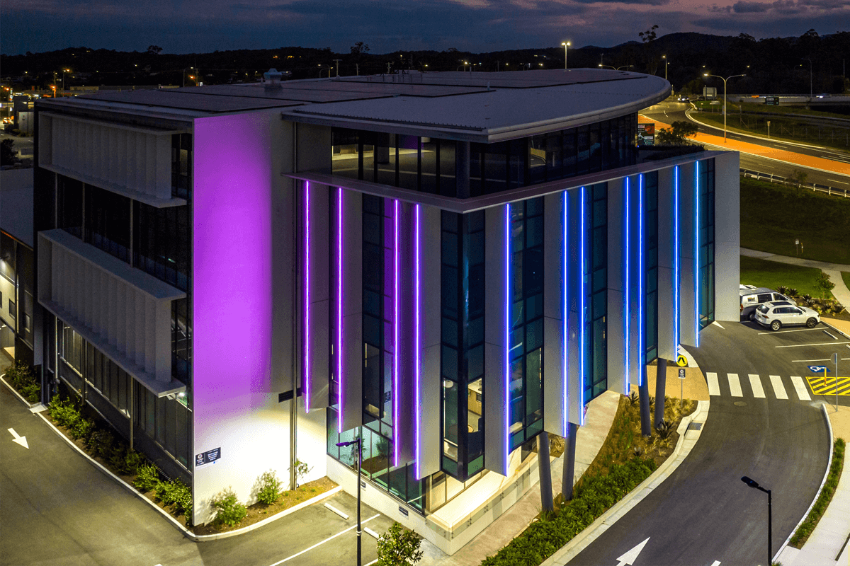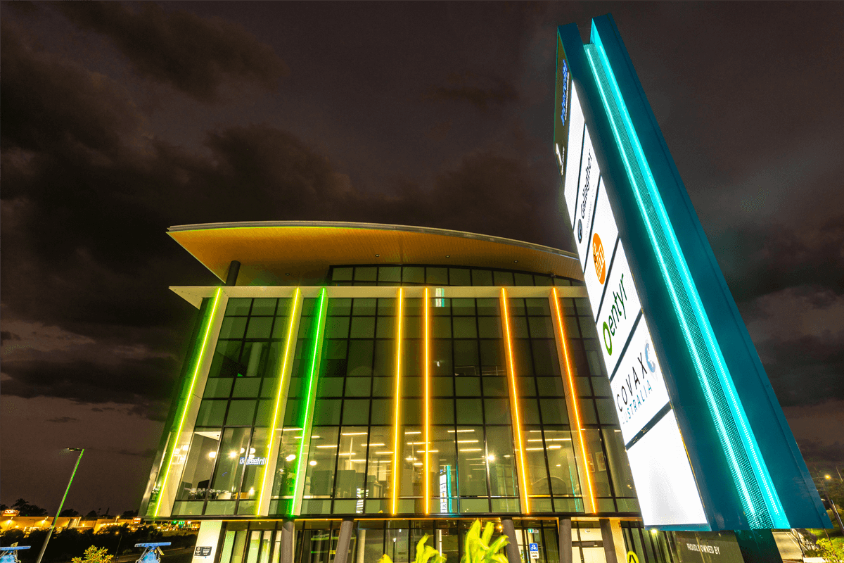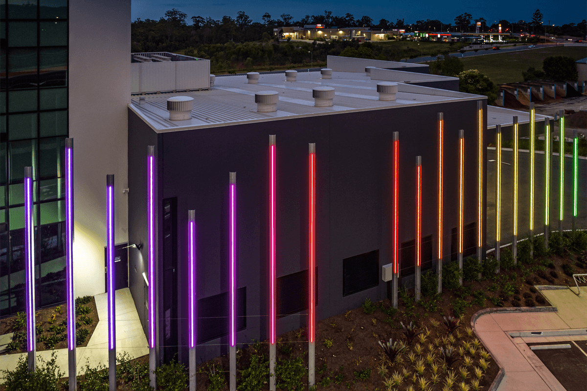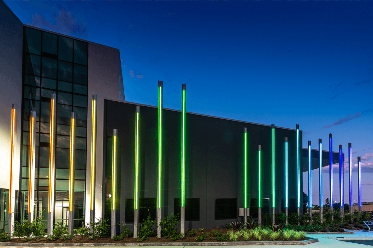 1 Zupp Drive uses DMX pillars of light to engage passersby with continually changing coloured Neon Flex strip lighting. Powder-coated extrusion was secured to the building's Sun Blades, while H beams were used as individual pillars, with mounted extrusion and AQS-421 finished the colour rendering.
