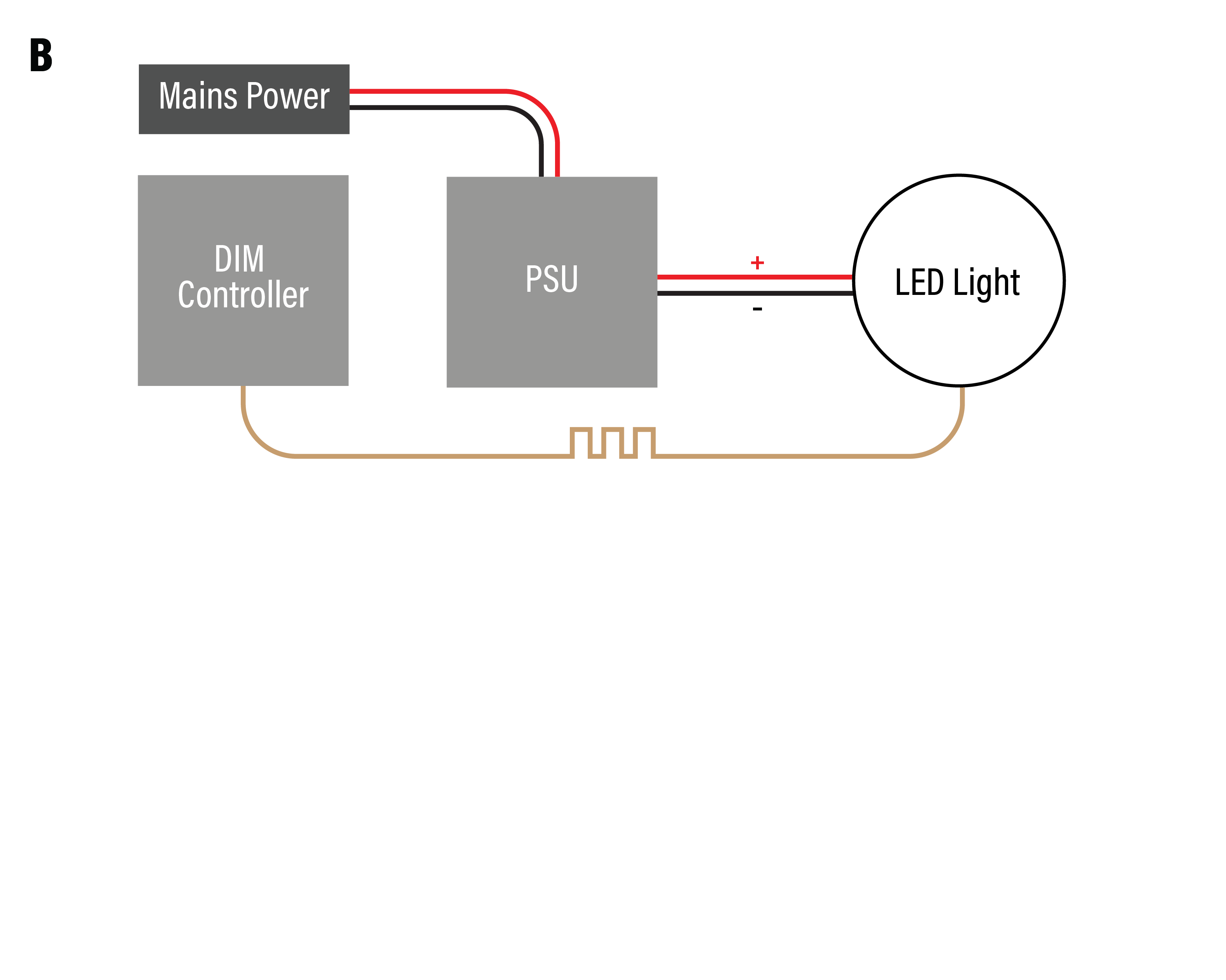 PWM power dimming can be achieved by using compatible power supplies that will require their own dimming control input. It can also be achieved by using a PWM module that sits between the power supply and lighting product and modifies the power to control the PWM dimming.