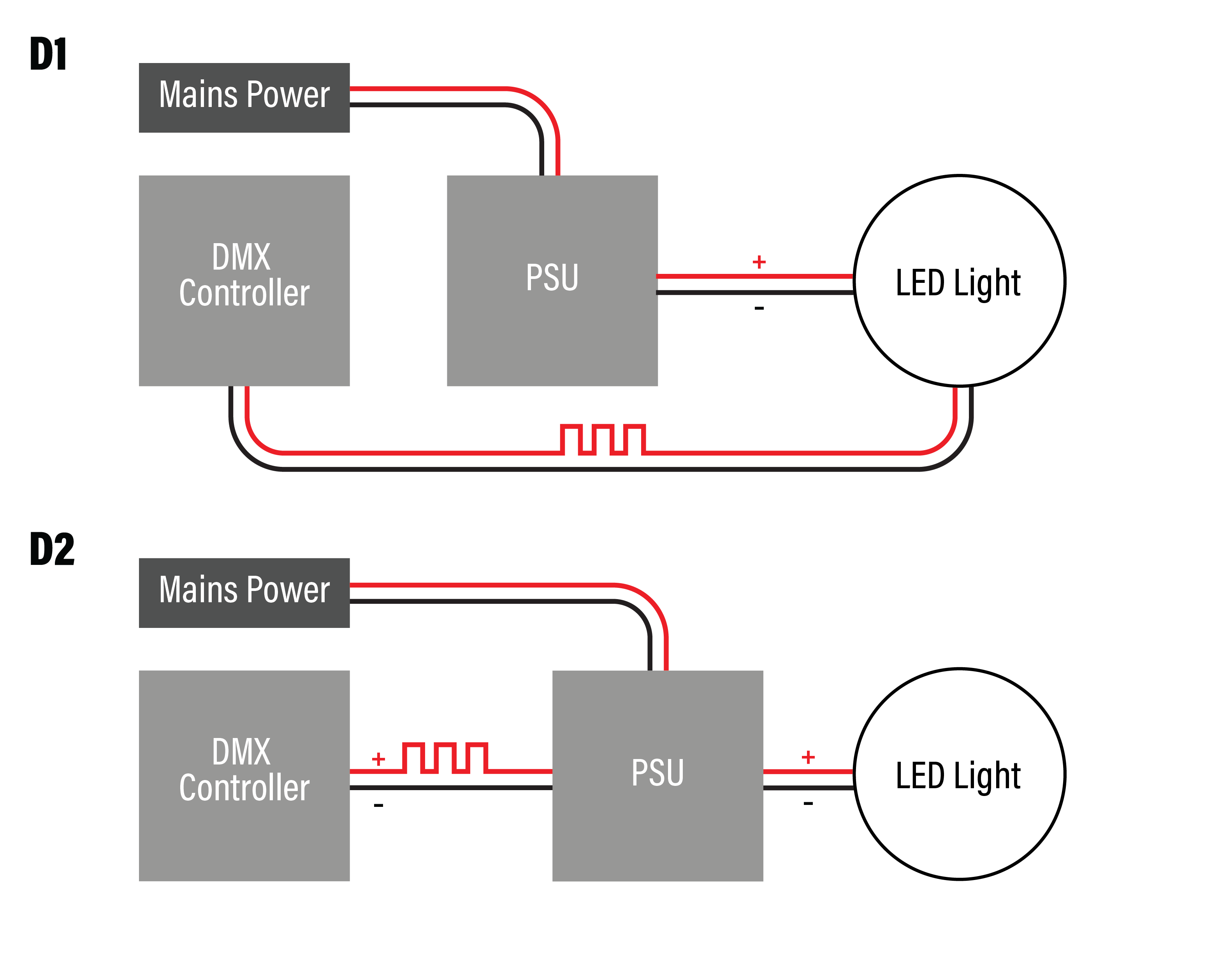 DMX requires a separate set of control cables to carry the data signals from a central controller to the lighting control systems and power supplies. It can be used with both low voltage and mains lighting products as the control system is completely separate from the lighting power supply system.