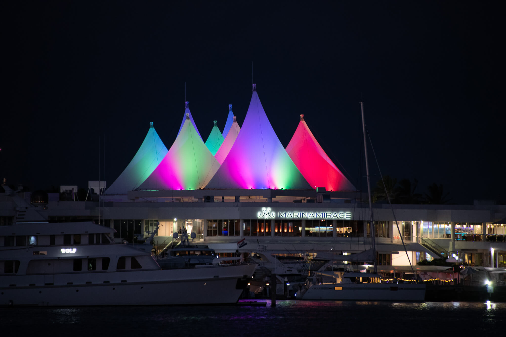 Large RGB exterior lighting design for the Marina Mirage precinct in Main Beach, QLD