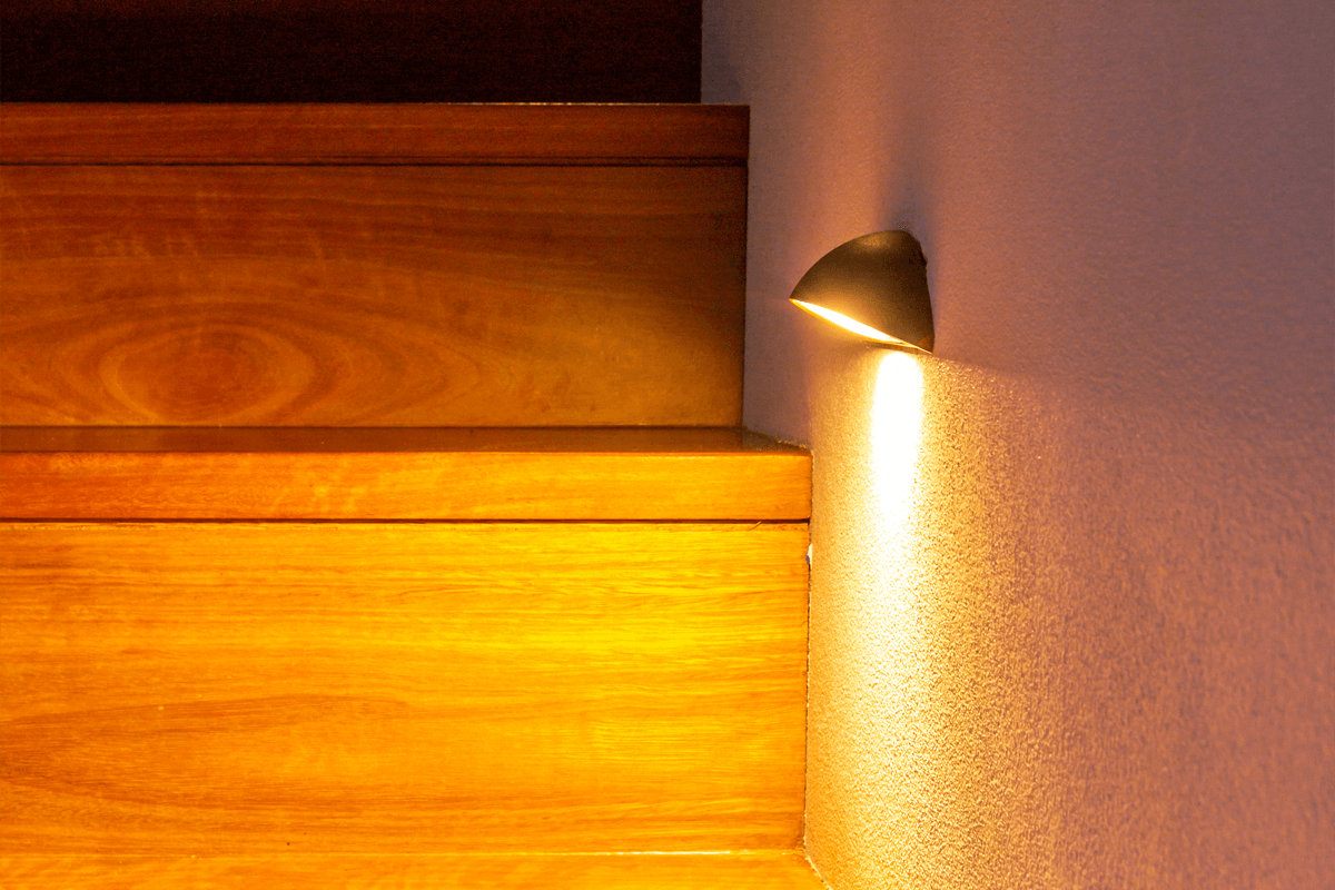 Liking the Aged Brass finish and half-moon shape of the AQL-510 Charlotte threw caution to the wind strategically placing them inside to light the hallways and stairwell. The low-lying step lights created a soft crescent light without overlighting the area, guiding your eye along the hallway to the outside, bringing the outside inside. Continuing the look and feel they used the step lights to highlight the stairwell.
