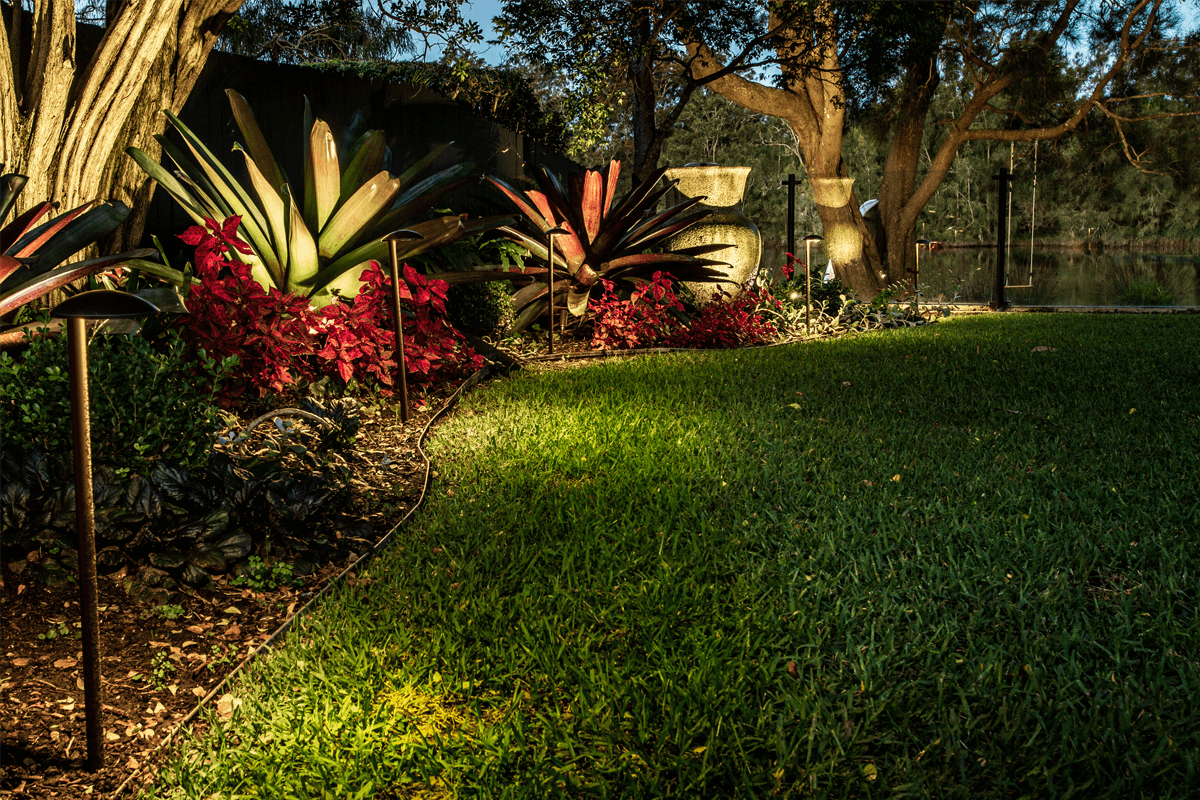 Lakeside Crescent North Manly - The picturesque garden and landscaping, reminiscent of a holiday paradise softly glow a warm white through the foliage creating a mixture of shadows and highlights. The AQL-122 define the edge between grass and garden, while the AQL-115 illuminate the palms and tropical plants.